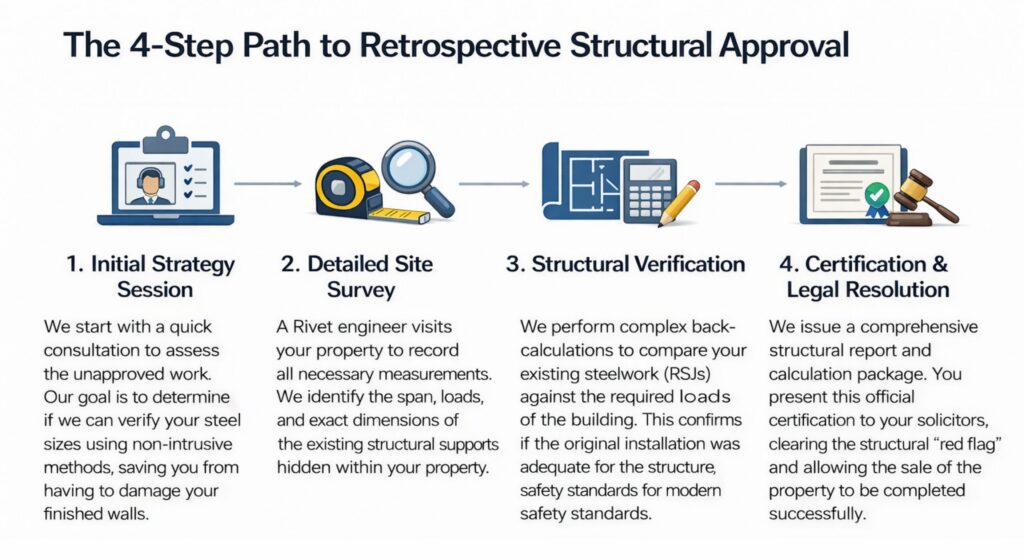 When Terry decided to sell the property, the buyer’s solicitor identified the lack of structural documentation. To prevent the sale from falling through, Terry needed a structural engineer to retrospectively verify that the steelwork (RSJs) installed over a decade ago was safe, adequate, and compliant with modern safety standards.